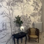A room perfect for a break from everyday life or creative inspiration. This room combines modern design with natural lightness. The harmonious blue wall creates a sense of calm and depth, while the stylish leaf wallpaper brings a touch of nature into the interior—lively, fresh, and yet wonderfully relaxing.